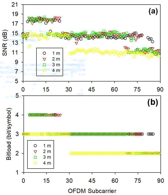 Then, to execute and generate the OFDM signal in the presented blue LED VLC system, the fast Fourier-transform (FFT) size, subcarrier number and cyclic prefix (CP) is set at 512, 90 and 32 over the effective bandwidth of 400 MHz, respectively. To understand the SNR performing of each OFDM subcarrier, Figure 3a exhibits the observed results after transmitting through different free space connection lengths within the available 400 MHz bandwidth. In the measurement, the SNRs of subcarriers are achieved between 10.54 and 18.15 dB, 10.86 and 18.27 dB, 10.73 and 18.35 dB and 10.24 and 15.01 dB through 1, 2, 3 and 4 m wireless VLC links, respectively, while the optimal and adaptive bit and power loading algorithm is applied. Here, the detected illumination of LED VLC signal can be enhanced after traveling through the focusing lens on the Rx site. Since the Si APD only has an available modulation bandwidth of 400 MHz, the SNR frequency range measured in Figure 3a is the obtainable bandwidth of the blue LED in this measurement. Figure 3a shows that all the measured SNR of OFDM carrier is greater than 10.24 dB within 400 MHz frequency bandwidth after through 4 m free space link. The experimentally measured SNR range will decrease as the VLC transmission distance increases. This is because the detected optical power will also decrease accordingly. Next, according to the obtained SNRs in the presented blue LED VLC transmissions, the corresponding bit number per symbol of 1 to 4 is also achieved, respectively, as illustrated in Figure 3b. Only under a wireless transmission distance of 4 m, the resulting bit number is distributed between 1 and 3. Since a higher SNR can result in a better bit number. Therefore, under a shorter VLC transmission distance, the overall bit number can be higher, as also seen in Figure 3b.
