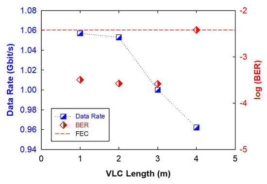 According to the obtained results of Figure 3, the achievable OFDM VLC data rates of 1.057, 1.053, 1 and 0.962 Gbit/s can be reached through 1, 2, 3 and 4 m free space connection lengths under the matching illuminations of 255, 133, 64 and 40 lux, respectively, as seen in Figure 5. Moreover, the detected bit error rates (BERs) of these VLC traffic rates can be also less than 3.8 × 10−3 to meet with the forward error correction (FEC) target, as displayed in Figure 5. The corresponding results show that the VLC data rate can be greater than 0.962 Gbit/s via utilizing single blue LED device, when the detected illumination is 40 lux after 4 m wireless VLC link. As seen in Figure 5, as the transmission distance of VLC becomes longer, the available traffic capacity will also become smaller due to the insufficient illumination (SNR). Consequently, the presented blue LED VLC system can achieve 0.962 to 1.057 Gbit/s data rate by utilizing the OFDM-QAM modulation with bit- and power-loading algorithm and 400 MHz bandwidth APD without analog equalization circuit on the Tx and Rx sites. Figure 2b is the measurement of the illumination of the most central position of the LED at a wireless transmission distance of 1 to 4 m. We know that, under the proposed VLC system, as long as the VLC light is collected through the focusing lens of the Rx site. Therefore, this also means that even under different transmission distances, as long as the illumination received is above 40 lux, the OFDM capacity can reach 0.962 Gbit/s. In this demonstration, there is no requirement for VLC signal alignment and transmission. We only need to consider the detected LED illumination for VLC connection.