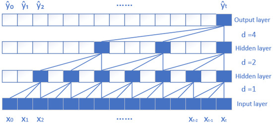 TCN is a one-dimensional convolutional network structure, which mainly consists of extended causal convolution and residual connection, and its structure is relatively simple. The extended causal convolution structure of TCN is shown in Figure 1 [17]. During the convolution operation of TCN, the input data can be sampled at a certain interval in order, and the certain interval is the sampling rate. In the figure, d represents the sampling rate; d = 1 indicates that every point is collected, and the higher the layer, the larger the d is. In the TCN network, the residual connection consists of a residual module that includes dilated causal convolution, weight normalization, activation functions, and regularization. This residual structure can avoid the loss of more information in the process of feature extraction, retain as much information as possible, and improve the accuracy of the model.