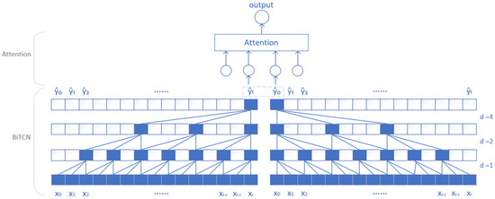 BiTCN is an improved version based on TCN. The disadvantage of TCN is that only forward features can be extracted and backward features cannot. To address this issue, BiTCN introduces a bidirectional convolution structure based on TCN, which retains the processing capability of TCN for time series and increases its ability to capture bidirectional information of the sequence. It can consider the past and future of information at the same time, thus enhancing its ability to fully capture the time series data of the patterns and associations. In order to make the model more flexible in learning the importance of different time points in the sequence, more attention needs to be given to important time steps when processing time-series data, further improving the prediction accuracy of the model. Therefore, this article incorporates an attention mechanism into the BiTCN model [18] and adopts the BiTCN-attention model. The structure of this model is shown in Figure 2.