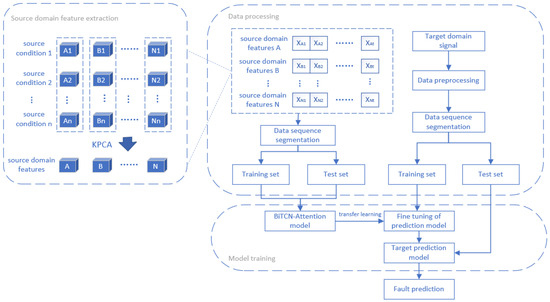 In this paper, a transfer learning method based on a Bidirectional Temporal Convolutional Network with attention (BiTCN-attention) is proposed, which migrates from the multi-source condition with lifecycle degradation data to the new target condition for fault prediction. The overall framework of fault prediction based on this method is shown in Figure 3.