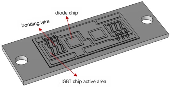 IGBT devices can be divided into weldability and crimp types according to their package type. At present, the IGBT devices used in the rod control power cabinet of nuclear power plants are weldable-type. In this paper, the 1200 V/75 A IGBT device (2MBI75VA-120-50, manufacturer name Fuji Electric Global, from Tokyo, Japan.) used in the rod control power cabinet of a nuclear power plant is selected as the research object, and COMSOL6.2 software is used to establish the electric-thermo-mechanical coupling finite element simulation model of the IGBT device. Its basic structure is shown in Figure 4.