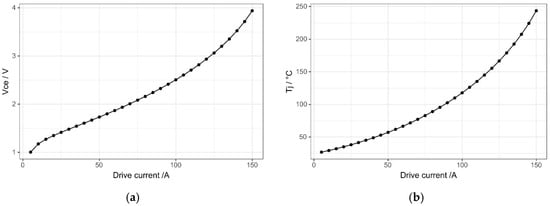 (a) Voltage curve of the simulation model under different currents; (b) Junction temperature curve of the simulation model under different currents.