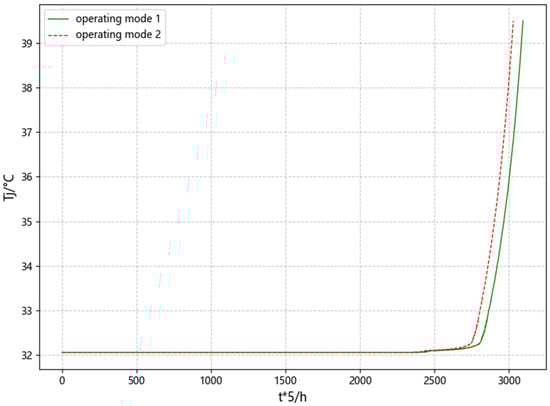 With the deepening of the aging degree and performance decline of IGBT devices, their characteristic parameters gradually offset, and after the initial aging occurs and lasts for a period of time, the device undergoes complete aging failure. According to the existing research results, the IGBT module collector–emitter on-voltage Vce is selected as the failure precursor parameter reflecting the aging state of the module, and the Vce is increased by 5% as the failure criterion of the module [25,26]. The simulation results of operating conditions are shown in Table 4. Taking operating condition 1 as an example, after IGBT runs for 15024.5 h continuously under operating condition 1, Vce increases by 5% and the device fails.