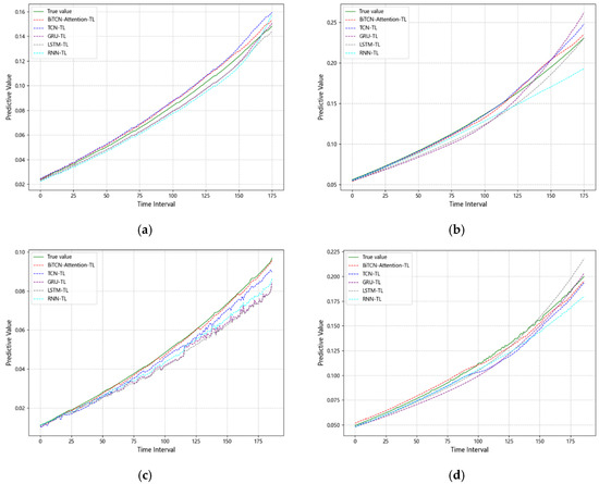 In order to verify the superiority of the IGBT aging fault prediction method proposed in this paper based on the BiTCN-attention transfer learning model, the same data set is used to predict faults by using the RNN-TL model based on recurrent neural networks, the LSTM-TL model based on long short-term memory, the GRU-TL model, and the TCN-TL model. The prediction results of the above five prediction methods on the test set are shown in Figure 7a–d. The mean square error (MSE), root mean square error (RMSE), mean absolute error (MAE), and coefficient of determination (R2) are selected as evaluation indexes to analyze the prediction results. The prediction performance evaluation results of the above five prediction methods in Scheme 1, Scheme 2, Scheme 3, and Scheme 4 are shown in Table 6.
