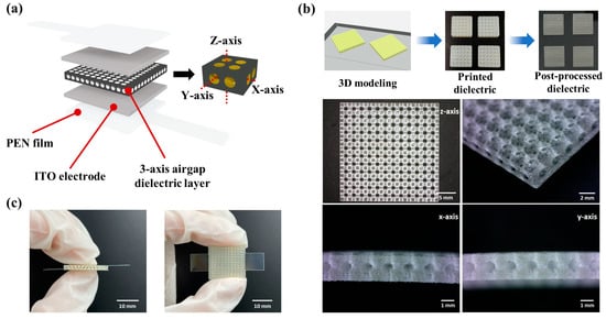 The 3-axis alignment airgap pressure sensor was designed as depicted in Figure 1a. To optimize the sensitivity and suitability of wearable devices, parameters such as the number of axes and pore sizes of the airgap were defined, and the device was fabricated with dimensions of 20 mm (W) × 20 mm (D) × 2 mm (H) (Figure S1). The fabrication process and results for the 3-axis alignment airgap dielectric layer are illustrated in Figure 1b. This process employed a PolyJet 3D printer (J850, Stratasys, Edina, MN, USA). The dielectric layer was constructed using a flexible polymer, Agilus30 (FLX935, Stratasys, Edina, MN, USA), and a support material (SUP706B, Stratasys, Edina, MN, USA). Post-printing, the dielectric layer underwent treatment in an alkaline solution consisting of 2% sodium hydroxide in DI-water, followed by the removal of the support material using a post-processing washing system (SCA3600, Stratasys, Edina, MN, USA). To eliminate residual moisture and ensure the complete curing of the dielectric layer, it was exposed to UV light for 1 h. The electrodes of the pressure sensor were fabricated using a 125 μm thick polyethylene naphthalate (PEN) film coated with a 180 nm thick indium tin oxide (ITO) layer (MTI, Richmond, CA, USA). This structure incorporated the alignment airgap dielectric layer between the film electrodes to assemble the flexible sensor. A photograph of the fabricated pressure sensor with the three-axis alignment airgap is shown in Figure 1c. A network analyzer (E5061B, Keysight, Colorado Springs, CO, USA) was employed to analyze the dielectric constant of the material. The load control of the pressure sensor was managed using a tension/compression stand (ESM303, Mark-10, Copiague, NY, USA) and a force gauge with a 0.5 N resolution (M5-100, Mark-10, USA). The sensor’s capacitance was evaluated using a semiconductor device analyzer (B1500A, Keysight, Colorado Springs, CO, USA) (Figure S2).