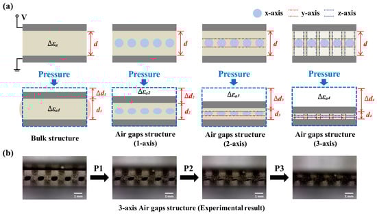 where is the permittivity of air, and is the permittivity of the dielectric layer. In capacitive sensors with a porous dielectric layer, the capacitance changes as applied pressure causes the pores to close, replacing the permittivity of air inside the capacitor with that of the dielectric material. This alteration in the overall capacitance results from the increase in the dielectric constant of the layer. This study introduces a 3-axis alignment airgap structure for the dielectric layer, which cannot be achieved using conventional mold fabrication techniques; thus, 3D printing technology is used instead. This innovation results in a flexible capacitive sensor with a broad detection range and enhanced sensitivity. Figure 2a illustrates the schematic changes in and when the same pressure is applied to four distinct sensor structures. Figure 2b shows the height displacement variation in the dielectric layer in a 3-axis alignment airgap structure (900 μm pore size) under different pressure conditions (P1 < P2 < P3). The results demonstrate decreased dielectric layer height displacement with increasing pressure.