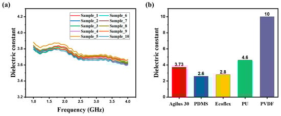 Characterization of the dielectric constant measured at 1–4 GHz. (a) Dielectric constant for 10 samples. (b) Bar charts comparing the dielectric constant reported in the literature using dielectric materials.