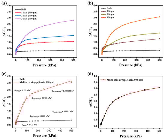 Pressure response curves of sensors for various structures (a) with 1–3 axes. (b) Pore size 500–900 μm. (c) Comparison of the sensor’s performance, alignment airgap and bulk. (d) Relative capacitance curves for the 20 sensor samples.