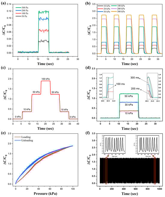 In addition to sensitivity, essential performance indicators for sensors encompass the detection limit, response time, stability, and repeatability. For a more comprehensive examination of sensor performance, a capacitive sensor based on the three-axis and 900 μm structure was selected. As shown in Figure 5a, the fabricated sensor is capable of detecting subtle pressures as low as 50 Pa. Figure 5b demonstrates the sensor’s response to cyclic pressures of 10 kPa, 20 kPa, 30 kPa, 100 kPa, 200 kPa, and 300 kPa. Across five cycles, the sensor produced almost identical outputs at each pressure level, increasing capacitance with rising pressure. This consistency indicates the sensor’s ability to differentiate between various pressure levels accurately. Despite an observed increase in the dielectric recovery time during the unloading of pressures above 200 kPa, the sensor remains suitably applicable for wearable devices that operate within pressure ranges below 100 kPa. Stable capacitance was also noted under stepwise pressure inputs of 10 kPa, 50 kPa, and 100 kPa, as depicted in Figure 5c. The sensor’s response to/recovery time for pressure changes are shown in Figure 5d, where the capacitance rapidly increased within 100 ms with loading pressures of 10 kPa, 30 kPa, and 50 kPa and maintained stability. Upon unloading, the capacitance returned to its initial state within 300 ms. A hysteresis analysis of the pressure sensor is presented in Figure 5e, with a hysteresis error of 8.6%, reflecting a commendable performance. Lastly, Figure 5f displays the results of a 1000 cycle repeatability test under a 100 kPa load, where the capacitance variation remained nearly identical, demonstrating exceptional stability and durability. These results affirm the superior characteristics of the detection limit, detection range, linearity, and stability of the fabricated three-axis alignment airgap pressure sensor, highlighting its practical value for pressure detection in real-world applications.