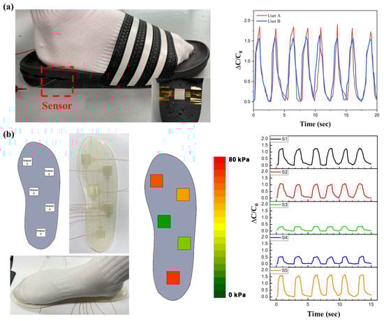 The three-axis alignment airgap capacitive pressure sensor, characterized by its high sensitivity, rapid response, and cyclic stability, is well-suited for wearable devices that monitor human movements in real time by detecting physical signals from the body. Among the application areas of pressure sensors, measuring the pressure distribution of the planter is performed in various fields, and analyzing gait patterns can help confirm balance or judge rehabilitation treatment and structural problems in the foot. Therefore, the fabricated sensors can be integrated into the insole to collect various gait patterns. As depicted in Figure 6a, the sensor was inserted into the heel of a commercial EVA (Ethylene Vinyl Acetate) slipper to monitor the walking motion of users weighing 50 kg and 70 kg for 20 s. During each step, the capacitance value significantly increased and swiftly returned to its original state as the foot was lifted from the ground. This change in capacitance effectively captures the difference in output values corresponding to the user’s weight. Building on these observations, five pressure sensors were designed and 3D printed for integration into an insole, strategically positioned at various locations to map the plantar pressure distribution, as illustrated in Figure 6b. These sensors were installed in the fabricated insole, and the plantar pressure distribution was measured as a 50 kg user stepped in place. It was observed that the pressure on each sensor increased, leading to a rise in capacitance when the user stepped. The pressure distribution across sensors S1–S5 was measured as 26.3%, 22.4%, 6.7%, 11.5%, and 33.1%, respectively, illustrating how the user’s weight was distributed across the foot. These findings affirm that the pressure sensors, employing 3D printing technology, exhibit exceptional stability and detection capabilities in real-world scenarios, validating their practicality in applications related to plantar pressure measurement.