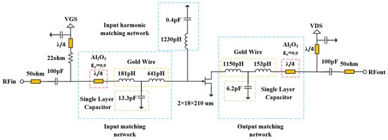 The GaN power amplifier can be realized through three primary methods: a Monolithic Microwave Integrated Circuit (MMIC), an external matching circuit (EMC), and an internally matched circuit. In comparison to an MMIC and EMC, the internally matched power amplifier demonstrates significant advantages in terms of device performance, size, and production cost [2]. To satisfy the design requirements for miniaturization, high efficiency, and high output power, the internally matched power amplifier has increasingly become a focal point of research and has found widespread applications in satellite navigation and radar detection fields [3,4,5].