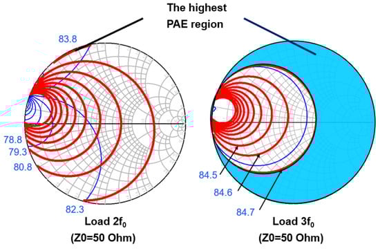 Second, the GaN HEMT undergoes 2nd and 3rd load/source pull simulations using precise modeling techniques. Figure 2 shows the 2nd and 3rd load pull simulation results. In Figure 2, the impedance point of the optimal PAE is offset compared with the ideal class F power amplifier due to the influence of the parasitic parameters of the transistor.