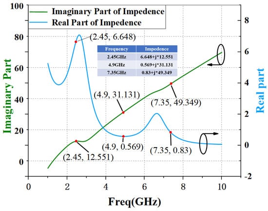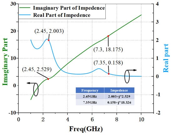 Simulation results of impedance curve of input matching circuit with harmonic tuning circuit.