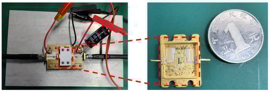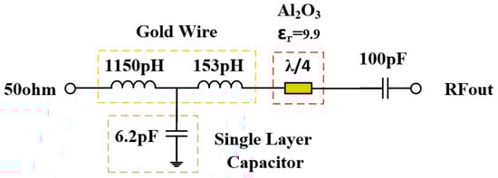 The components in the matching circuit are realized by different substrate materials, and then all the components are glued to the inside of the tube shell by conducting resin, and finally connected by gold wire. The inductance L is achieved using a bonding wire with a diameter of 25 µm. Capacitor C is implemented using thin-film technology, and the substrate material is made of alumina ceramics with a relative dielectric constant of 9.9. The capacitance value of the parallel plate capacitor can be calculated by (4).