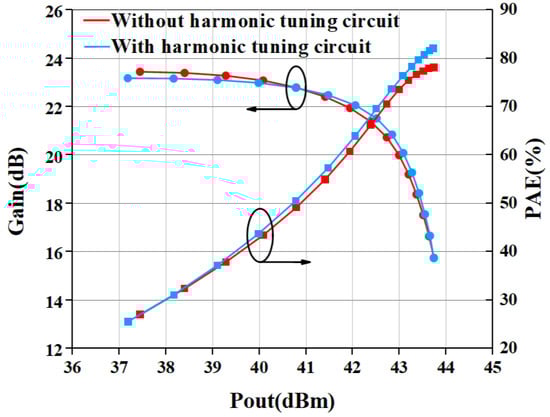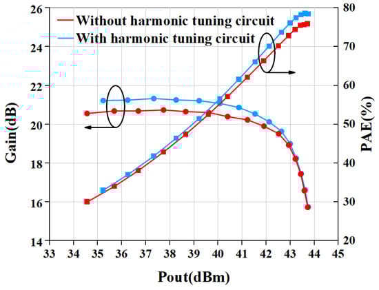 Figure 7 shows the simulated result of large-signal performance with and without a harmonic tuning circuit. The output power and gain at saturation in the two cases have almost no difference. The biggest difference in PAE between the with and without harmonic tuning cases is 4% when the PA saturates.