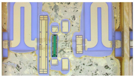 We evaluated the RF performance of an internally-matched power amplifier with the measurement fixture. Figure 8 is the top-view picture of the GaN power amplifier using a harmonic tuning circuit and measurement fixture. The detail of the proposed PA is given with an enlarged photo shown in Figure 9. The metal cavity underneath the measurement fixture is used to improve the heat dissipation of the internally-matched power amplifier. The width of a single gate finger is 210 μm. The package size is 13.4 × 13.5 mm2. The internally-matched power amplifier is tested under the condition of a CW signal. The drain bias voltage is 28 V, and the quiescent drain current is 50 mA.