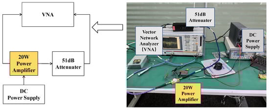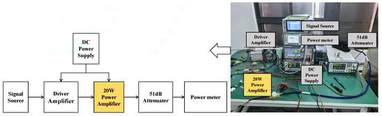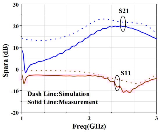 Figure 10 is the picture of the small-signal parameter measurement setup. Vector Network Analyzer ZVB 8 from Rohde & Schwarz is applied to measure the small-signal parameters. A 51 dB attenuator is applied to prevent the overpowering of the Vector Network Analyzer. Figure 11 presents a comparison between simulated and measured small signal results from 1 to 3 GHz. It can be seen that the measured input reflection coefficient is less than −8 dB, which is 3 dB lower than the simulated one. The measured small-signal gain is better than 19.8 dB, which is 2 dB lower than the simulated one. The discrepancy between the measured and simulated S-parameters is mainly caused by the SMA connector at the input and output of the measurement fixture and the inaccuracy of the GaN active device model.
