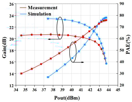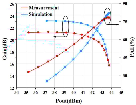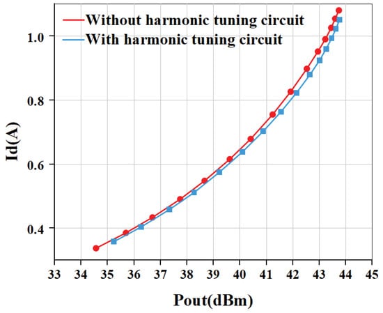 Figure 13 gives the comparison result of measured and simulated data of the proposed PA. The gain and PAE curves are shown in Figure 13. The saturated power of the internally-matched PA is 43.75 dBm (23.71 W), while the PAE is 78.5% when input with 28 dBm power. The gain is 21.2 dB in the linear range and 15.75 dB at saturation power. The is 42.13 dBm. In addition, we also measured the output power and PAE of the power amplifier without an input harmonic tuning circuit, as shown in Figure 14. The measurement of PA without a harmonic tuning circuit is done after removing the bonding wire of the input harmonic tuning circuit. When the input power is 28 dBm, the output power of the power amplifier is 43.73 dBm (23.6 W) while the PAE is 76.0%. This indicates that the PA is still in a high-efficiency mode, which means the output harmonic load is much more important than the input harmonic load. In our design, the output matching has already satisfied the output harmonic load condition so that the PA can perform well without input harmonic tuning. It can be seen from Figure 15 that the PAE of the harmonic tuning circuit is 2.5% higher than that of the non-harmonic tuning circuit under the same output power, which is mainly due to the reduction in the dynamic drain current as shown in Figure 16. In addition, it can be seen that there is a certain gap between the measured result and the simulated result. From Figure 13 and Figure 14, the simulation results with harmonic tuning have a larger gap with measured results than the simulation without harmonic tuning. And, all the measured results show lower output power when the input power is low. This indicates that the harmonic load of the GaN model is not correct in the low-power region. It can be noticed that the simulated PAE is lower than the measured results; the inaccuracies in the Pdc representation within the GaN model contribute to these issues. Additionally, discrepancies between the modeling test environment and the application test environment lead to variations in simulated Pdc. This has a significant influence on PAE and gain simulation in low-power regions.