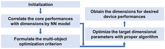 Ideally, the NNs in dimension optimization can be regarded as a generator to quickly produce size parameters that can meet the measuring requirements. This work can be divided into four steps: (1) the key performances and target dimensions are clarified; (2) a dataset, containing the correlation between performances and dimensions, is established for NN training, validation, and test; (3) a proper NN model is constructed, trained and tested to map the correlations in dataset and predict the device performance under a certain size combination; (4) the trained NN plays the function of generator to quickly provide practical dimensions according to the required performance. It is not necessary to fully execute all these operations in every design, and the role of NNs also varies within different works.
