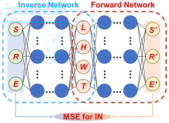 However, the NNs in these abovementioned works still do not function as a dimension generator, which can directly produce dimensions according to the input performances (namely, the reverse model of these predictive ones). This proposal may suffer from the issue that a certain performance can be achieved by different dimensions, which may bring out the one-to-many mapping non-uniqueness problem in the training of reverse NNs and make them converge with a large error [,]. To address this issue, Zhang et al. merge a forward prediction model with a reverse generation model to create a tandem network that can rapidly output the corresponding geometries for the sensing diaphragm in MEMS capacitive pressure sensors []. As shown in Figure 4, the tandem network uses a reverse network to map from performances to size and a forward network to map from size to performances, and the output of the reverse network is subsequently input to the latter. The forward network is independently trained based on the FEA dataset. The weights of the reverse network are then updated according to the deviation between its inputs and the performance predicted by the forward network with the dimensions from the reverse network. After necessary validation and testing, the whole tandem network can fulfill the function of the dimension generator. In the task for a square sensing diaphragm, the tandem network can achieve an error of 7.05 × 10−6 after 9.2 × 103 epochs in the measuring range, sensitivity, and linearity. In contrast, the error of a single inverse network can be up to 3.71 × 10−2, demonstrating the superiority of this new network model. Additionally, FEA results show that the generated diaphragm can achieve all these target performances with an error of <0.91%. Considering the generating speed, the time required by a tandem network is only 3 ms, while the time consumed by traditional FEM can be up to 103 s. This tandem network approach features high accuracy and versatility, high design efficiency, and low computational cost.