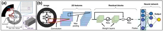 The structure for the ResNet model in predicting performances of resonator: (a) 100 × 100 pixelated binary 2D image to present the resonator; (b) structure of the ResNet model. Reproduced under the terms and conditions of the Creative Commons Attribution License of [].