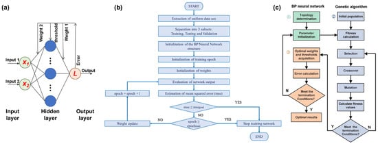 BPNN in the temperature compensation of MEMS sensors: (a) basic BPNN, (b) procedure for using BPNN, and (c) procedure for using GA-BP. Reused with the permissions from [,].