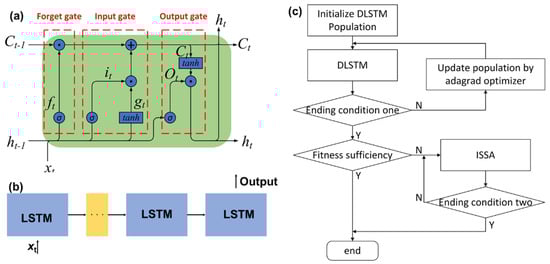 LSTM in the temperature compensation of MEMS sensors: (a) basic LSTM, (b) varied DLSTM, and (c) procedure for using ISSA-LSTM. Reproduced under the terms and conditions of the Creative Commons Attribution License of [].