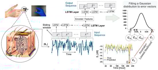 Similar calibration methods can also be used to determine the concentration of material under test (MUT) by measuring the dielectric constant with microwave sensors []. The working principle of these devices can be found in the relevant references [,]. Chaisaeng et al. use the soluble solid content (SSC) of a sugar solution and the corresponding intermediate frequency of an X-band sensor as the dataset to train an ANN. A predicting accuracy of 92.98% for the SSC is achieved, endowing the low-cost X-band sensor with the ability of classifying SSC level determination in real-time []. A similar approach can be found in the in-vivo test for non-invasive monitoring of glucose in humans []. The whole process of this work is indicated in Figure 11. The |S11| of a coupled SRR/Patch under a fingertip press is used as the input of the LSTM to detect possible anomalies in blood GL and predict its future values. The resultant sensing system has demonstrated its great potential for being deployed in highly sensitive applications for noninvasive interrogation of ambient interstitial glucose levels. Albishi modulates the frequency response frequency responses of microwave near-field sensors based on a two-port microstrip line to characterize the material parameters []. A Bayesian regulation backpropagation artificial neural network (BRANN) produces a robust model to predict the dielectric constants of different MUTs (obtained by adjusting the ratio of chloroform and cyclohexane) through the frequency responses of sensor. The realized accuracy for analyzing MUT composition can be up to 99.97%.