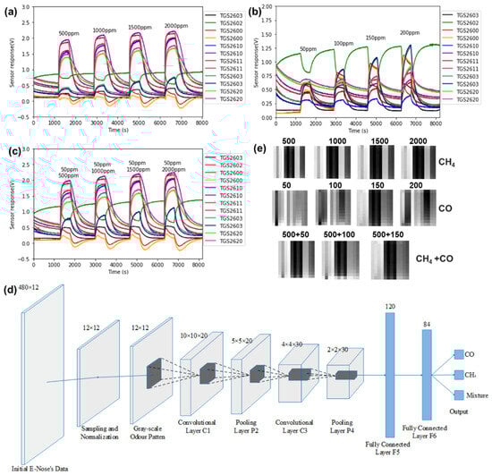 Using LeNet-5 for gas identification: the responses of 12 sensors to CH4 (a), CO (b), and CH4 + CO (c); (d) the proposed LeNet-5 structure for gas identification; (e) patterns of downsampled matrixes used in LeNet-5 for different gases (unit: ppm). Reproduced under the terms and conditions of the Creative Commons Attribution License of [].