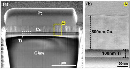 Microstructure of Ti-Cu seed layer sputtered on glass substrates: (a) FIB image; (b) SEM magnification image of area “A”.