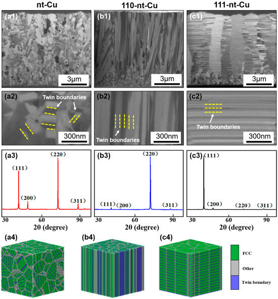 Cross-sectional FIB images of electroplated Cu and corresponding XRD results: (a1–a3) nt-Cu; (b1–b3) 110-nt-Cu; (c1–c3) 111-nt-Cu. (a1–c1) FIB images; (a2–c2) magnification image; (a3–c3) XRD results; (a4–c4) three-dimensional atomic arrangement model.