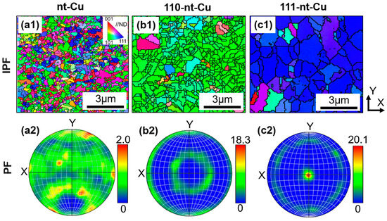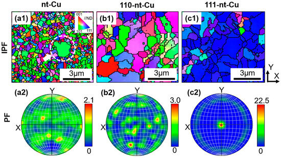 Plan-view EBSD images of electroplated Cu results: (a1,a2) nt-Cu; (b1,b2) 110-nt-Cu; (c1,c2) 111-nt-Cu. (a1–c1) Inverse pole figures; (a2–c2) Pole figures of {111}.
