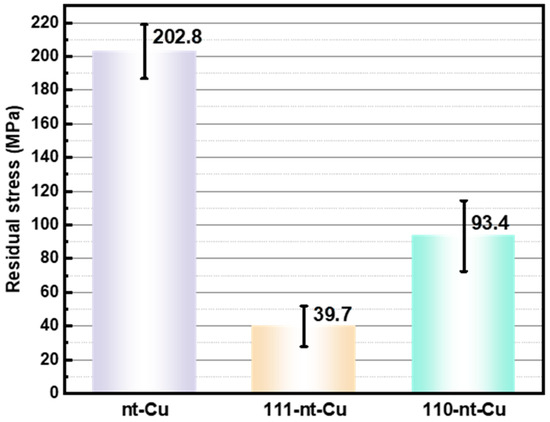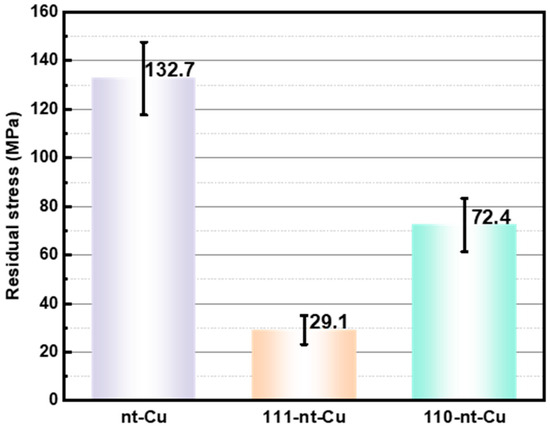 Figure 4 shows the residual stresses of electroplated Cu with three different nanotwin directions, which are calculated by sin2ψ-strain method-based XRD technology. Specifically, the residual stresses of nt-Cu, 111-nt-Cu, and 110-nt-Cu are 202.8 MPa, 39.7 MPa, and 93.4 MPa, respectively. 111-nt-Cu has the lowest residual stress after electroplating. The value of the residual stress is highly related to the direction of the nanotwins.