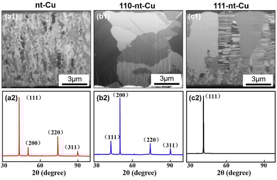 FIB and XRD results of electroplated Cu results after annealing at 200 °C for 2 h: (a1,a2) nt-Cu; (b1,b2) 110-nt-Cu; (c1,c2) 111-nt-Cu. (a1–c1) FIB results; (a2–c2) XRD results.