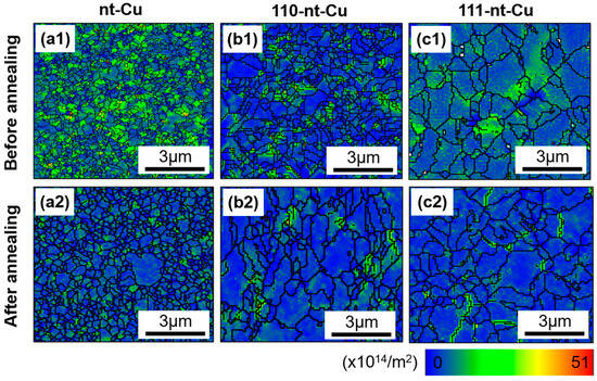 Distribution map of geometric necessity dislocation of electroplated Cu: (a1,a2) nt-Cu; (b1,b2) 110-nt-Cu; (c1,c2) 111-nt-Cu. (a1–c1) Before annealing; (a2–c2) after annealing.
