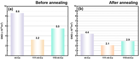 As shown in Table 2, the average geometric necessity dislocation density of nt-Cu, 111-nt-Cu, and 110-nt-Cu decreased by 48.8%, 34.3%, and 47.3%, respectively, compared with that before annealing, indicating that the lattice distortion and small orientation difference introduced in the electroplating process decreased. The decrease in geometric necessity dislocation density is caused by recrystallization behavior, because the recrystallization behavior of grains during annealing can cause grain boundary migration and sub-grain merger, resulting in the annihilation of dislocation and the reduction of grain boundaries. The reduction of dislocation density would inevitably reduce the degree of lattice distortion and then reduce the residual stress in electroplated Cu. Therefore, it can be concluded that the reduction in residual stress of electroplated Cu after annealing treatment can be attributed to the decrease in geometric necessity dislocation density.