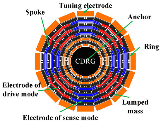 The schematic diagram of the CDRG structure is illustrated in Figure 1. It comprises 10 concentric hexagonal rings, with the hexagon selected for convenience in the external electrode correspondence, though other regular polygon frames can be considered. These rings are alternately connected to the central anchor point through eight spokes. Each ring is connected end-to-end by 16 identical rectangular beams. Although the resonator appears as a disk with multiple rings, it is actually an all-linear structure. The diameter of the outermost ring measures 3.8 mm, while the diameter of the central anchor is 1.7 mm. A small solid mass, with a width of 77 μm, is suspended in both an odd-numbered ring and an even-numbered spoke layer, extending from the inside to the outside. The resonator’s thickness is 100 μm, and the widths of the spokes and rings are 13.5 μm and 13 μm, respectively. Surrounding the resonator are 16 uniformly distributed external electrodes for frequency tuning and orthogonal zeroing. There are eight independent slots between the rings, where internal double electrodes are inserted to enhance the conduction area for drive and detection. Additionally, a regulating electrode is inserted into the inner groove to improve the tuning capability, with a capacitance gap of 7.5 μm.