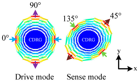 The resonator is a planar structure, and the selected working vibration mode features a pair of in-plane elliptical bending. The wave-belly angle difference between the drive mode and the sense mode is 45°, while the phase difference is 90°. This vibration mode is commonly referred to as the wineglass mode, specifically, the n = 2 cup mode. The working mode shapes of the CDRG are illustrated in Figure 2, with the resonant frequency 18,188 Hz. The main structural parameters of the final design are summarized in Table 1.