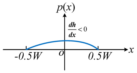 When the rectangular plate moves downward and the film is compressed (dh/dt < 0), the pressure becomes positive. At this moment, the pressure at x = 0 is the largest, 3 μW4/2 h3 (where dh/dt < 0); while the pressure at x = ±W/2 is 0. The pressure distribution is illustrated in Figure 4.