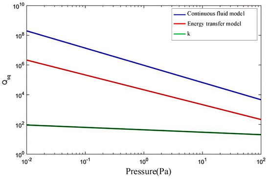 Given the parameter T = 298.15 K (in order to ensure the consistency with the experimental temperature, the following are set at room temperature of 298.15 K), meff = 0.268 mg, , and p = 0.07 Pa, and according to Equation (15), the quality factor of the squeeze film damping in the modified continuous fluid model is 2.075 × 107.