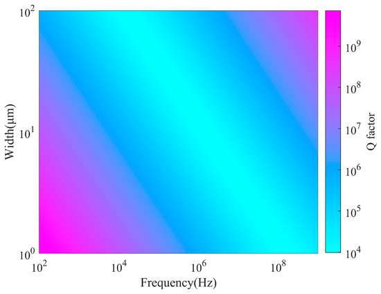 where ω0 is the natural frequency and τ = W2ρCp/kπ2 is the thermal relaxation time. Obviously, the quality factor QTED is partially dependent on the material properties, which may also vary with ambient temperature T0. Additionally, the thermal relaxation time τ is related to the heat transfer rate across the entire cross-section of the resonant beam and depends on the beam width W (which defines the length of the heat flow path). Furthermore, the natural frequency ω0 is influenced by both the size of the beam and its material characteristics. The function describing Debye behavior reaches a minimum at the frequency ω0 = ωmin = 1/τ. Therefore, the QTED of the resonator changes significantly depending on the proximity of the natural frequency ω0 to ωmin. When ω0 = ωmin, QTED takes the minimum value, corresponding to the maximum thermoelastic damping; when ω0 < ωmin, the heat transfer time constant is shorter than the vibration period, making the system effectively isothermal. Conversely, when ω0 > ωmin, the heat transfer time constant exceeds the vibration period, rendering the system adiabatic. Table 3 lists the material properties of (111) monocrystalline silicon, while Figure 7 illustrates the relationship between QTED, the ring width (beam width) and frequency. The color bar in the figure represents the magnitude of the Q value. For a MEMS gyroscope with a ring width of 13 μm, the analytical solution for QTED using the Zener model is 2.452 × 105 at room temperature (T = 298.15 K).