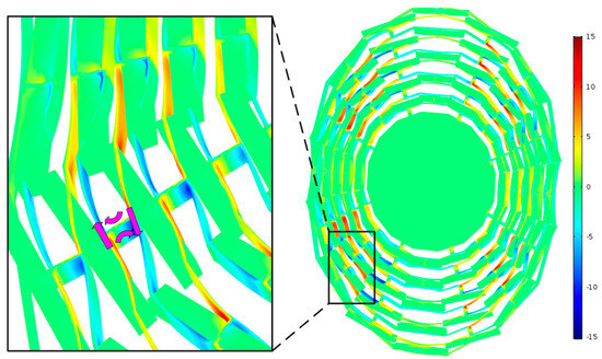 The thermoelastic damping of the MEMS cobweb-like disk resonator gyroscope was simulated using COMSOL 6.2, with the temperature gradient distribution of the operational mode shown in Figure 8. Areas with higher temperatures (in the compressive stress zones) are depicted in red, while those with lower temperatures (in the tensile stress zones) are shown in blue. The purple arrows illustrate the direction of heat flow.