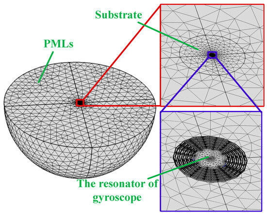 where f is the resonator’s vibration frequency. The MEMS cobweb-like disk axisymmetric gyroscope resonance frequency design value is 18,188 Hz, as shown in Table 3, and it is calculated that λ = 4.72 × 105 μm. This value is used to define the edge length of the Perfectly Matched Layer (PML). The quality factor Qanchor of the anchor damping can be expressed as follows [25]: