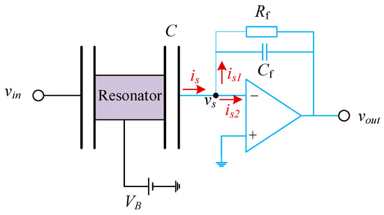 For the CDRG, a charge amplifier serves as the pre-detection circuit module, as illustrated in Figure 10. The blue curve in the figure is the charge amplifier module, vin is the excitation AC voltage, VB is the offset DC voltage, C is the gyro detection capacitor, vs. is the gyro output voltage signal, and Rf and Cf are the feedback resistance and capacitance of the charge amplifier, respectively. According to Figure 10, the resonant vibration of the gyroscope can be described by the control equation of a second-order mechanical system, with the electrostatic force generated by two electrodes, as illustrated below [31].