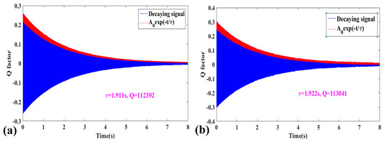Two common methods exist for measuring the quality factor (Q): the frequency response method and the time decay method. For high-Q resonators, the −3 dB bandwidth is very narrow, making the measurement of Q values using the frequency response method increasingly difficult and prone to error. As a result, the time decay method is used for measuring the Q value of the resonator. Initially, the resonant frequency is determined using the sweep method, and the resonator is then excited at this frequency. After allowing the oscillation to reach a stable state, the excitation signal from the signal generator is turned off, and the decay oscillation data are collected using the NI data acquisition card. The Hilbert transform is then applied to extract the envelope of the signal, and the time constant τ and Q are derived by fitting an exponential decay model. The time required for the amplitude to decay to 1/e of its initial value is defined as the time constant τ, from which the quality factor Q can be calculated using the following formula: