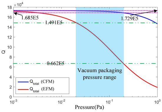 In Figure 12, the theoretical analysis results comparing the relationship between the total quality factor based on the modified continuous fluid model (CFM) and that based on the energy transfer model (EFM) with pressure and at room temperature (T = 298.15 K) are presented. According to previous studies on the damping loss mechanisms of vibrating ring gyros, the pressure range for wafer-stage vacuum packaging is approximately 0.02 Pa to 0.2 Pa, influenced by the adsorption effect of the getter, which is the light blue area in Figure 12. In the corresponding pressure region, the total quality factor for the CFM ranges from 1.685 × 105 to 1.729 × 105 (see the purple dotted line in Figure 12), while the quality factor for the EFM spans from 0.662 × 105 to 1.491 × 105 (see the green dotted line in Figure 12).