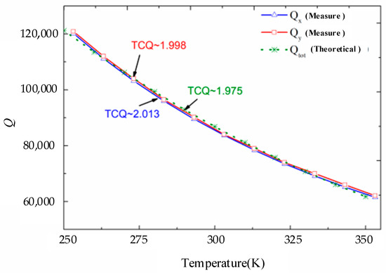 Furthermore, the theoretical model of the total energy dissipation mechanism loss mechanism based on the energy transfer model can be further validated through a temperature characteristic test of the quality factor. The temperature characteristics of the total energy dissipation mechanism are primarily influenced by both the air damping loss mechanism and the thermoelastic damping loss mechanism. To describe the temperature dependence of the quality factor, the temperature coefficient (temperature coefficient of quality factor, TCQ) is introduced. Typically, the TCQ is expressed in an exponential form, such as Q∝T−TCQ.