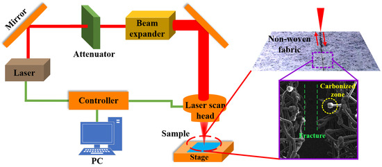 Fibrous fabric is widely used in medicine [1,2], clothing [3], industry [4], and other fields due to its characteristics of moisture resistance, breathability, flexibility, flame retardancy, low price, recyclability [5,6,7,8,9], etc. For non-woven fabric, the traditional methods of cutting mostly use knives, which causes easy wear of materials [10]. In addition, cutting different patterns and shapes requires diverse tools, which can easily bring about low efficiency in cutting work [11]. Therefore, it is of great significance to seek a simple and efficient method for cutting non-woven fabric.
