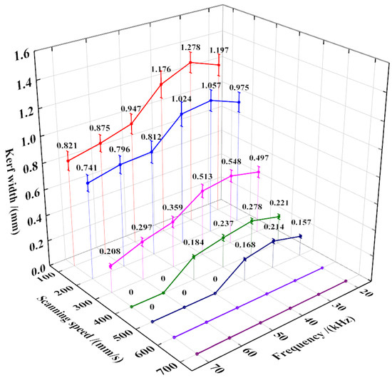It is known that laser processing parameters play an important role in cutting effect and quality [18]. The relationship between the laser frequency and the power, pulse width, and power density can be found in Table 1. It can be seen that the single pulse energy and power density both increase first and then decrease with the increase of frequency and reach the peak value at 30 kHz. Subsequently, the influence of laser processing parameters on the kerf width is investigated. As shown in Figure 2, the kerf width decreases with the increase of scanning speed. Moreover, the kerf width shows a trend of increasing first and then decreasing with the increase of the frequency and finally reaches a peak value of 1.278 mm at a scanning speed of 100 mm/s and a frequency of 30 kHz. This is because the increase in scanning speed leads to the gradual number reduction of laser pulses applied to the single irradiation point, resulting in less energy applied to the fabric while the single pulse energy remains constant [19]. Furthermore, the number of single laser pulses increases with the increase in frequency, but the energy and power density of the single laser pulse decrease. In this case, the short duration causes the direct breakage of the chemical bond inside the non-woven fabric, forming a preliminary fracture [20]. As the energy is further absorbed, a burning zone appears around the kerf and splashes out the ionized and vaporized material, leading to the kerf width first increasing and then decreasing [21]. While the scanning speed is higher than 600 mm/s, the instantaneous thermal effect is unable to fuse the fabric leading to a kerf width of 0, meaning that the non-woven fabric is not cut off. The change of the kerf width corresponds well with the change of the pulse energy, as shown in Table 1. Obviously, the energy absorbed by the non-woven fabric is higher while the single pulse energy is high, which will induce a bigger kerf width.